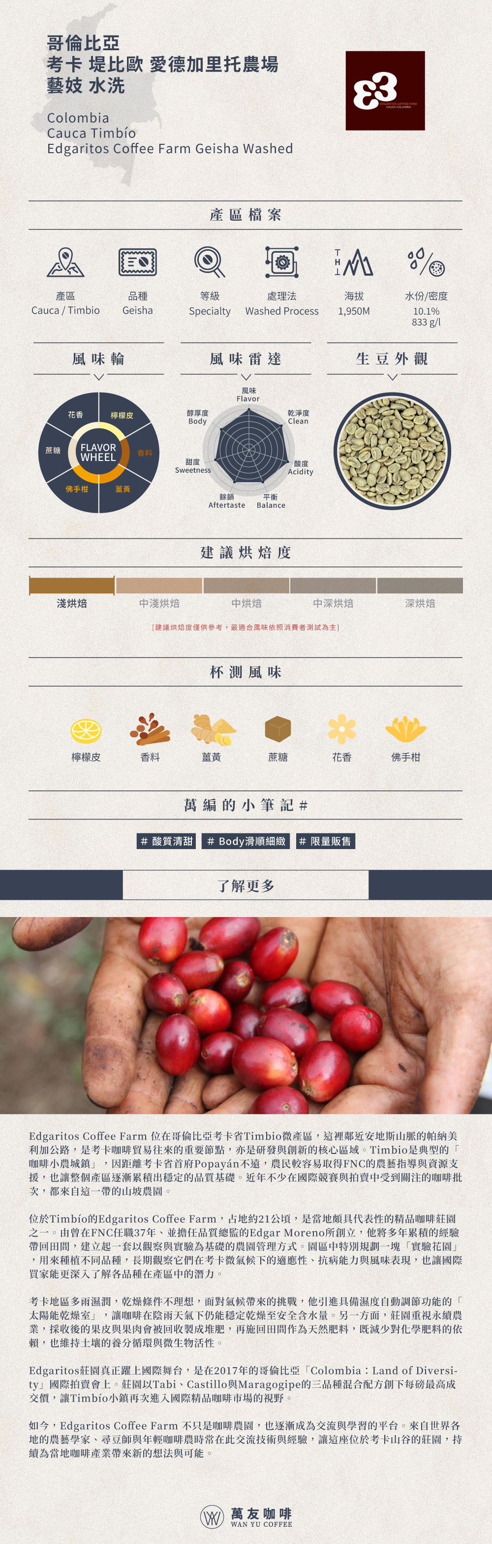 風味::檸檬皮、香料、薑黃、佛手柑、蔗糖、花香,酸質清甜,Body滑順細緻