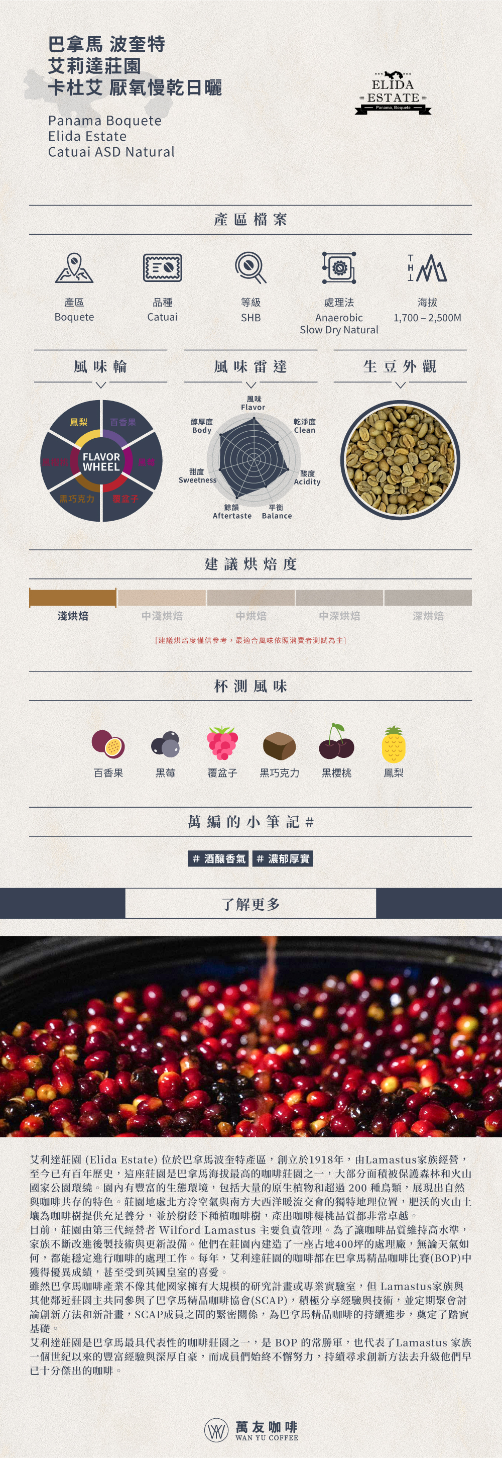 風味:百香果、黑莓、覆盆子、黑巧克力、黑櫻桃、鳳梨,酒釀香氣,Body濃郁厚實