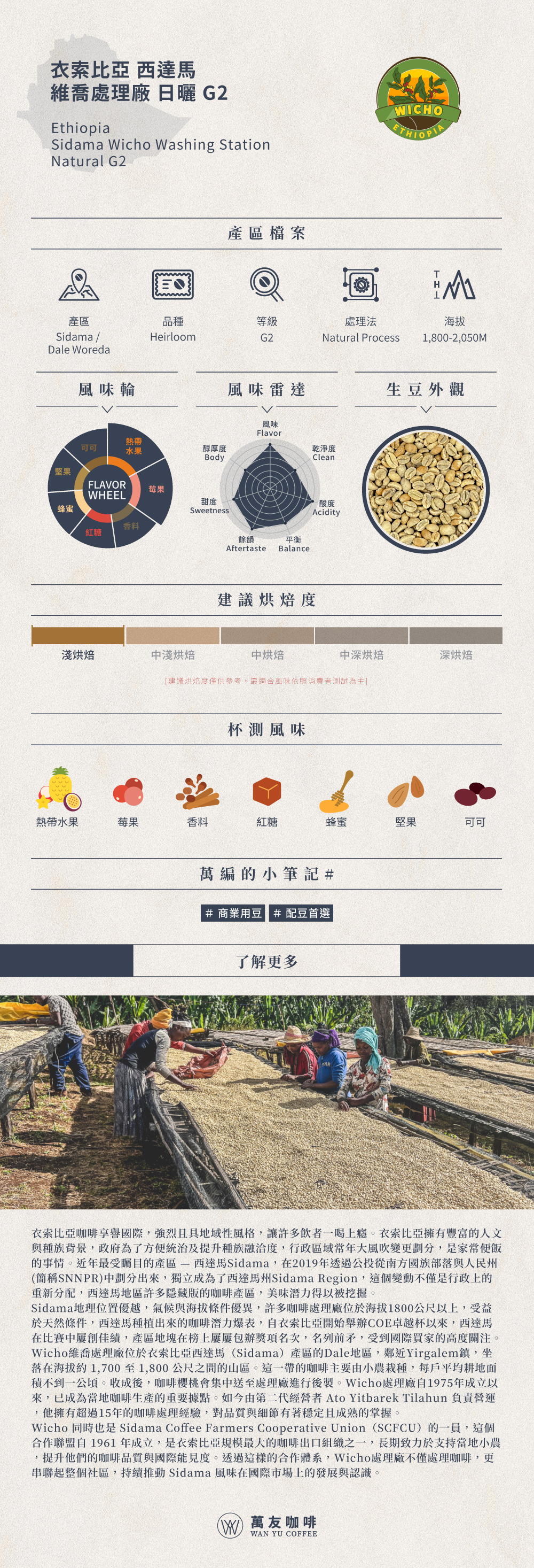 風味:熱帶⽔果、莓果、香料、紅糖、蜂蜜、堅果、可可,酸甜平衡,風味細緻